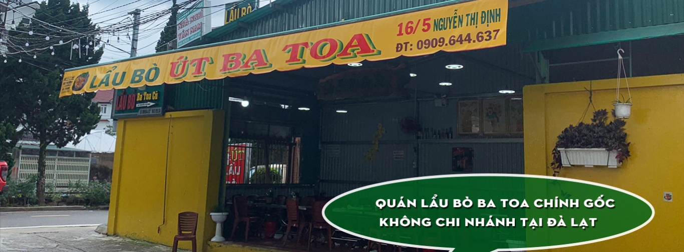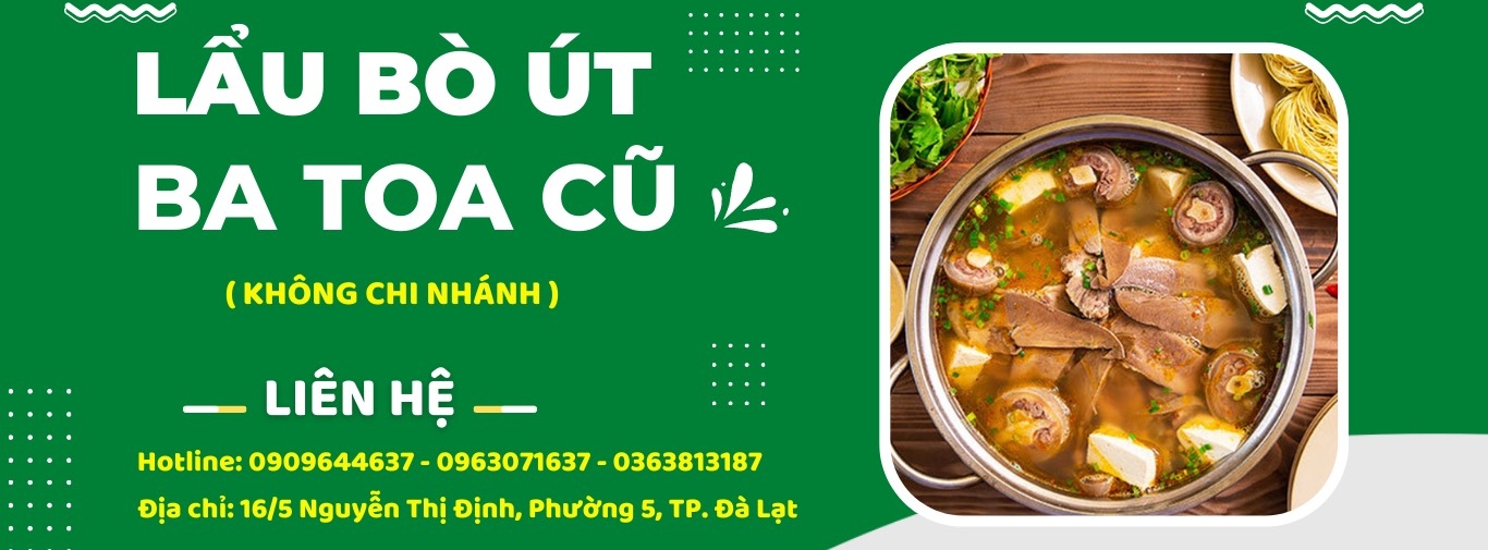 Quán Lẩu Bò Út Ba Toa Cũ địa chỉ: 16/5 Nguyễn Thị Định, TP. Đã Lạt được dân địa phương lẫn du khách tìm đến hơn 30 năm qua. Vì Món Ăn Ngon, giá phải chăng, nổi tiếng tạo nên thương hiệu qua bề dày hoạt động nhiều năm của quán là nguyên nhân chính. Lẩu Bò Út Ba Toa Cũ được đánh giá là một trong những quán lẩu bò ngon ở Đà Lạt. Và cũng là một địa chỉ luôn nằm trong top 10 quán lẩu Đà Lạt ngon nhất nên quán khi nào cũng thu hút đông khách đến thưởng thức....